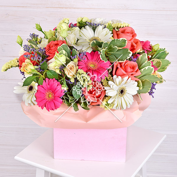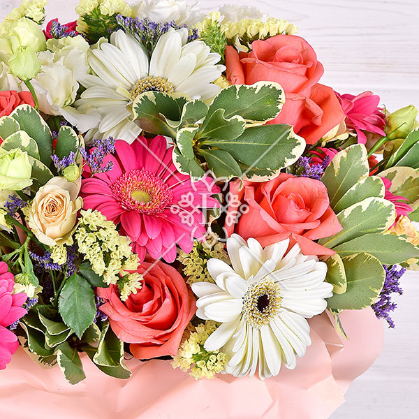 Розовая гербера  означает пожелание счастья , белая – здоровья и благополучия, оранжевая роза символизирует очарование,  роза желтая кустовая –восхищение,  белая  эустома – признается в искренних чувствах , белая  гвоздика – это пожелание удачи и успеха во всем, а желтая статица  расскажет получательнице о том, что для того, кто дарит эти цветы она незабываема!